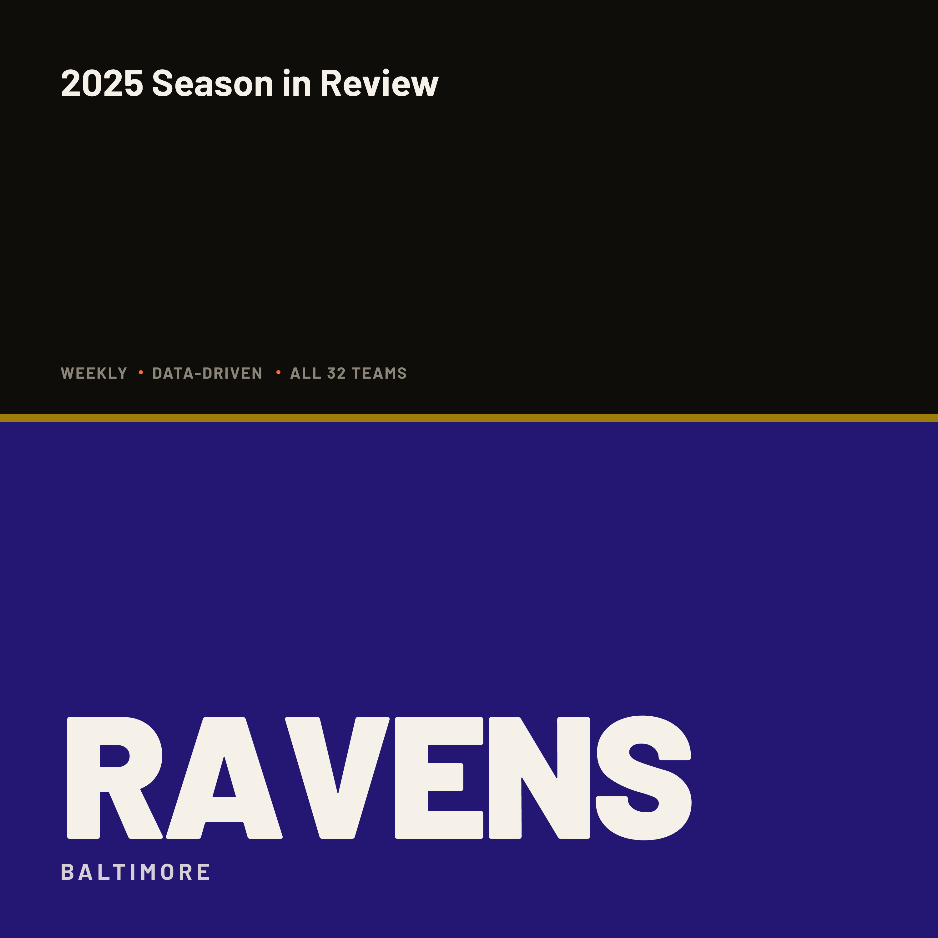 The Baltimore Ravens finished 2025 at eight and nine, missing the playoffs for the first time since 2021, getting swept by the Steelers, and closing the book on the John Harbaugh era two days after Week 18. This was supposed to be a Super Bowl team — preseason odds had them among the favorites — and instead they got muffed. They blew a fifteen-point fourth-quarter lead in Buffalo to open the year, started one and five for the first time in a decade, ripped off a five-game winning streak, then watched Tyler Loop's game-winner sail wide in Pittsburgh in Week 18 with a division title on the line. They tied the franchise record for home losses with six. The offense had teeth when Lamar Jackson was upright and the ground game was the plan; the defense, gutted by injuries up front, earned a new and unwelcome reputation as closers who could not close.