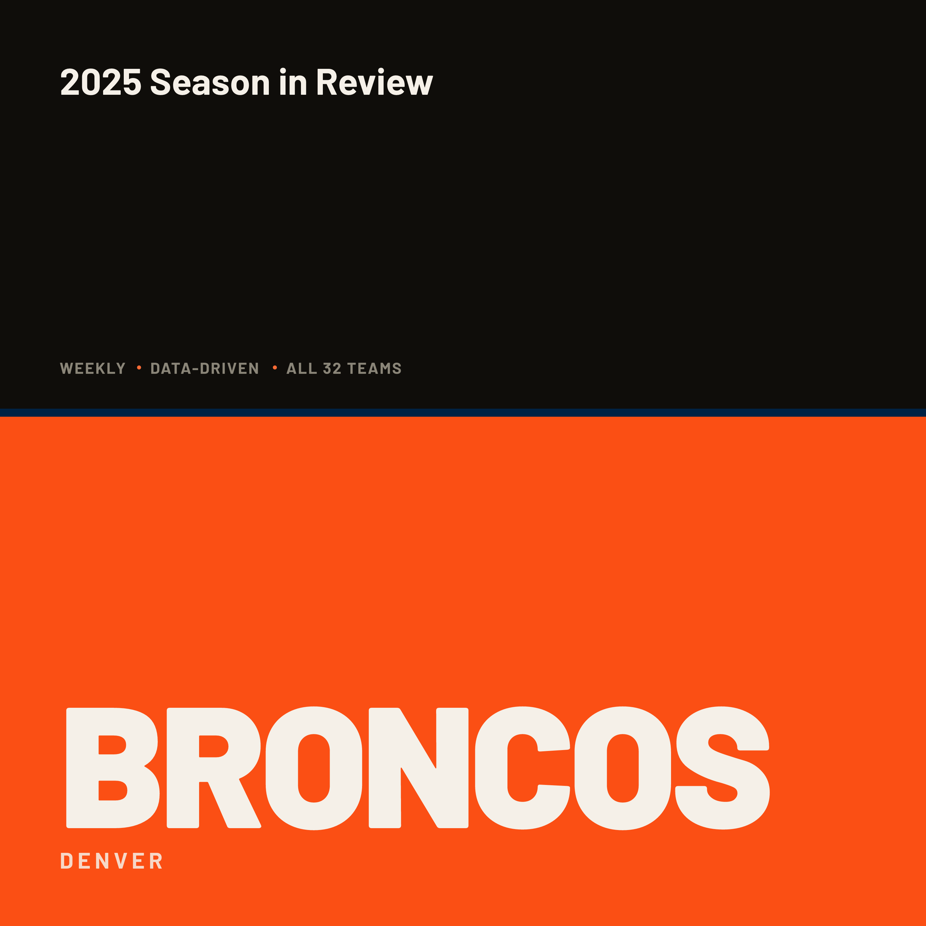 The Denver Broncos went 14-3, claimed the number one seed in the American Football Conference, and watched their dream season die one game short of the Super Bowl, falling 10 to 7 to the New England Patriots in the Conference Championship after Bo Nix fractured his ankle in the Divisional Round win over Buffalo. This team tied a franchise record for regular-season wins, snapped a ten-year playoff-victory drought, and dethroned the Kansas City Chiefs atop the AFC West. Denver lived on the razor's edge — twelve one-score wins and an eleven-game winning streak that tied the longest in franchise history. Sean Payton built a championship-caliber defense that hid the offense's rough edges, and Nix took the leap into franchise-quarterback status. The tone of 2025 in Denver: survive, then dominate, then a cruel injury one Sunday too early.